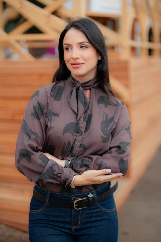 Seja em um evento social na cidade ou em um dia de campo, a Blusa Alicia eleva sua presença. Desenvolvida para a mulher que busca no estilo agro-chic uma forma de expressar sua história, esta peça se destaca pela estampa exclusiva da Loja da Cabana, trazendo o simbolismo dos cavalos em um design contemporâneo e fluido.