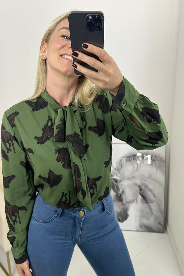 Elegante e cheia de identidade, a Blusa de Amarração Laura é confeccionada em tecido de toque pêssego (90% poliéster e 10% elastano), garantindo leveza e fluidez. Possui mangas longas, vista com botões, punhos quadrados e estampa exclusiva de cavalo. O detalhe de amarração no pescoço finaliza a peça com charme e referência sutil ao universo equestre.