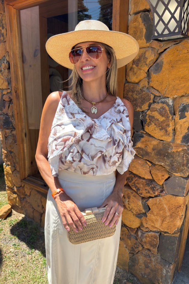 Confeccionada em tecido composto por 90% poliéster e 10% elastano, esta blusa apresenta toque macio, elasticidade leve e caimento fluido que acompanha o movimento. A modelagem foi desenvolvida para oferecer conforto e delicadeza, trazendo alças com regulagem para melhor ajuste e babados frontais que criam volume suave e valorizam o visual. O design é finalizado com estampa exclusiva de cavalos, destacando a identidade autoral da peça.