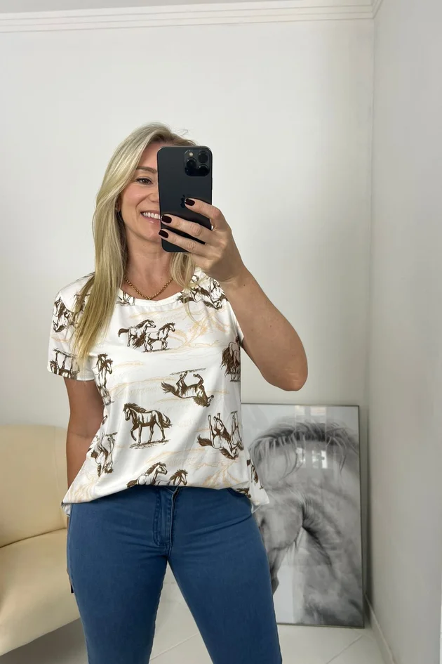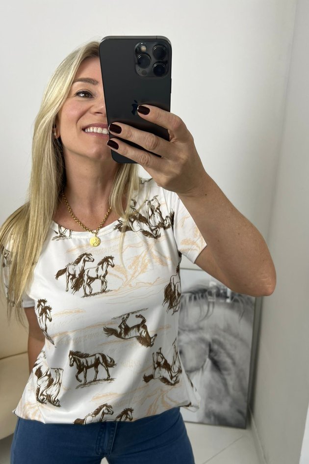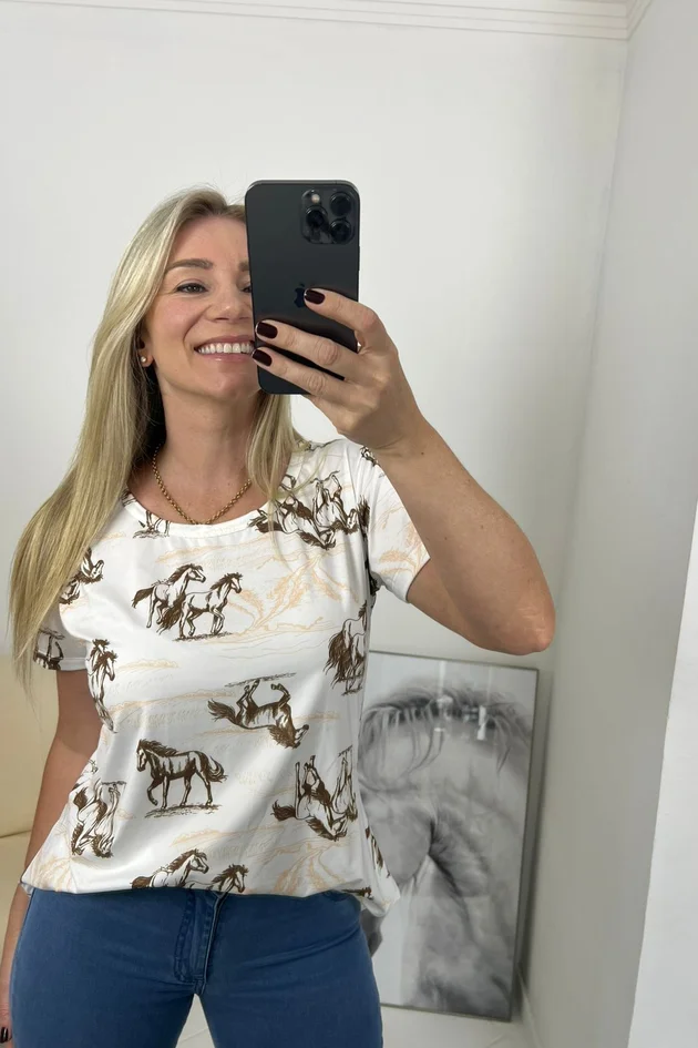 A Blusa Feminina Grazi apresenta as seguintes características: Decote arredondado que garante um visual discreto e versátil; Manga curta , ideal para o clima mais quente e para looks casuais, seu caimento é levemente solto proporcionando conforto e liberdade de movimento. As estampa em sublimação personalizada e oferecem um visual moderno e sofisticado. O Tecido leve e geladinho é perfeito para a estação, garantindo frescor; os desenhos autênticos com temas equestres dão um toque único à peça. A parte de trás alongada, proporcionando maior conforto e autenticidade ao look. Essa blusa é uma peça-chave para compor um look elegante e confortável.