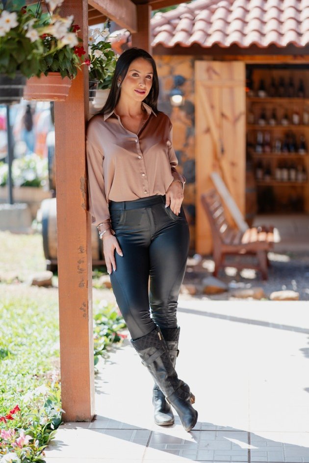 A Calça Montaria Alice é feita com 92% poliéster e 8% elastano, oferecendo um tecido de alta qualidade que garante conforto e elasticidade. A modelagem montaria possui um cós alto que modela a cintura e o quadril, proporcionando um ajuste perfeito e um caimento elegante. O acabamento brilhante confere sofisticação à peça, enquanto o tecido pelúciado na parte interna assegura toque macio e conforto durante o uso.
