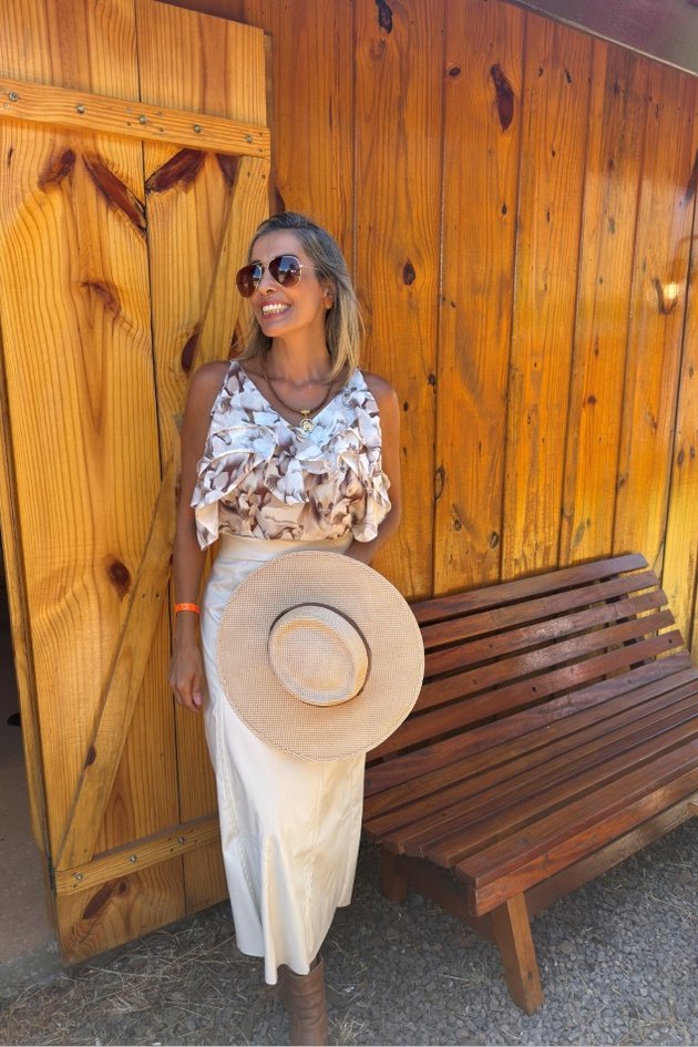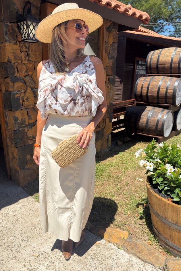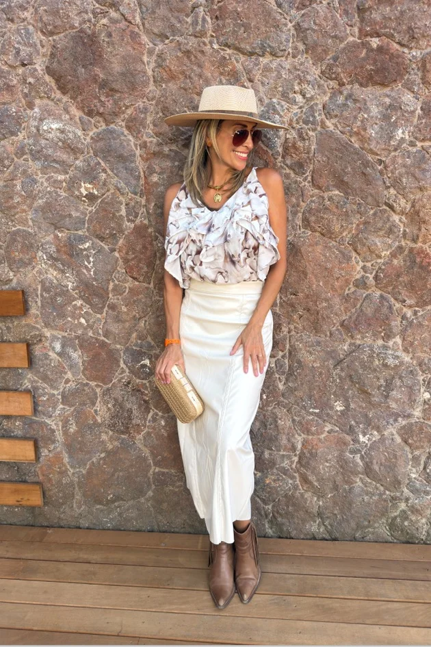 A Saia Feminina Courino Off White é uma peça moderna e sofisticada, ideal para compor looks elegantes e com personalidade. Com comprimento midi, essa saia oferece um toque de sofisticação e versatilidade, sendo perfeita tanto para ocasiões formais quanto para eventos mais casuais. Sua modelagem evasê proporciona um caimento solto e fluido, valorizando diferentes tipos de corpo.