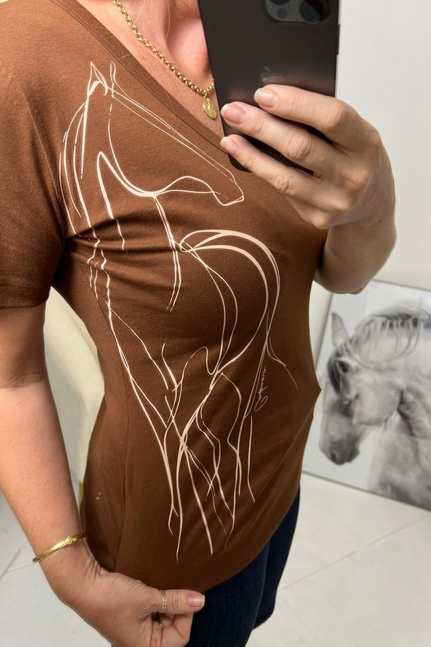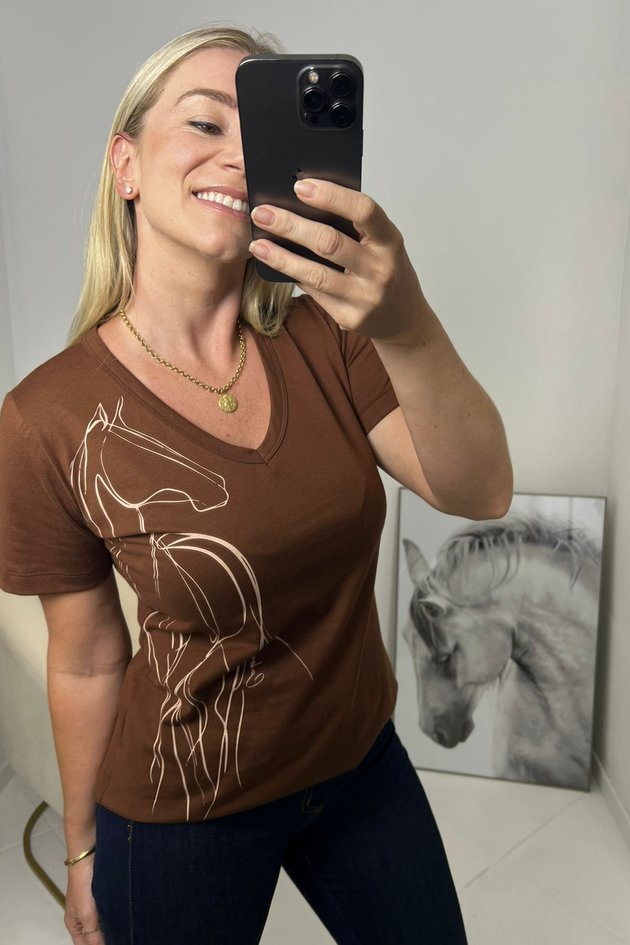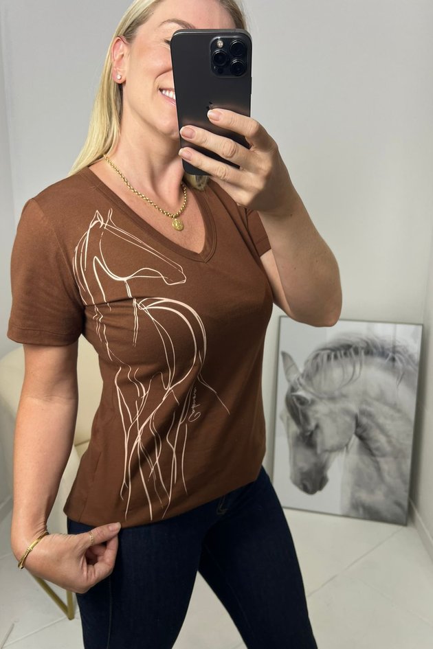 Com modelagem levemente ajustada e decote em V, valoriza o visual com elegância e praticidade. A estampa personalizada de cavalos traz o charme característico da marca, adicionando um toque moderno e exclusivo.
