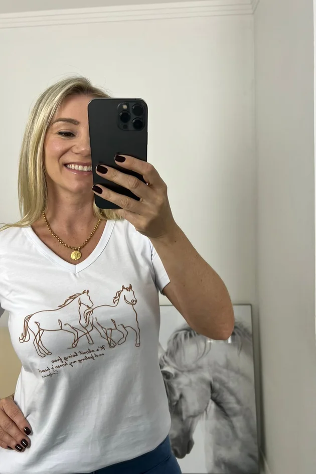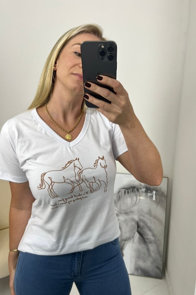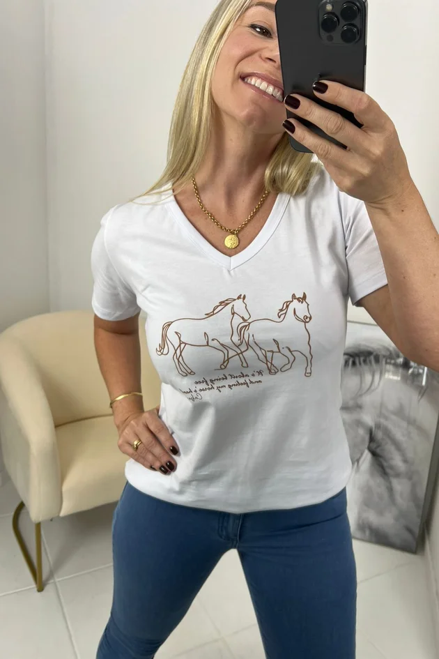 Com modelagem levemente ajustada e decote em V, valoriza o visual com elegância e praticidade. A estampa personalizada de cavalos traz o charme característico da marca, adicionando um toque moderno e exclusivo.
