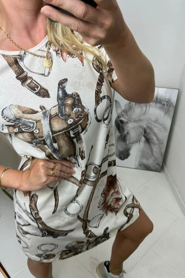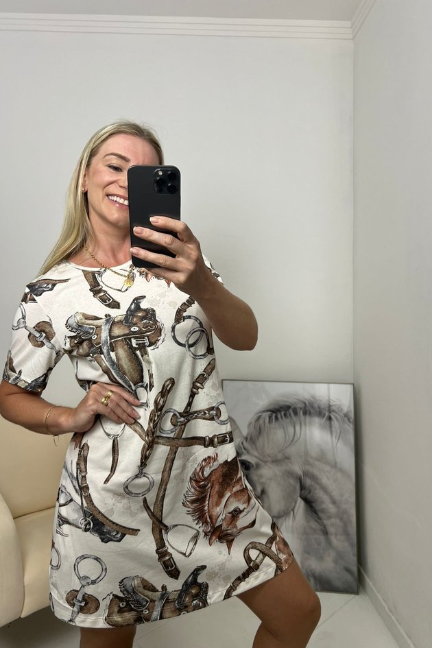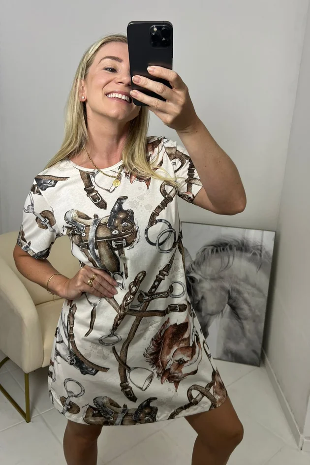 Vestido em 100% algodão, com toque macio e respirável, ideal para o dia a dia ou momentos de descanso. A estampa exclusiva de inspiração equestre traz identidade e autenticidade à peça, enquanto a modelagem confortável garante liberdade de movimento e versatilidade.